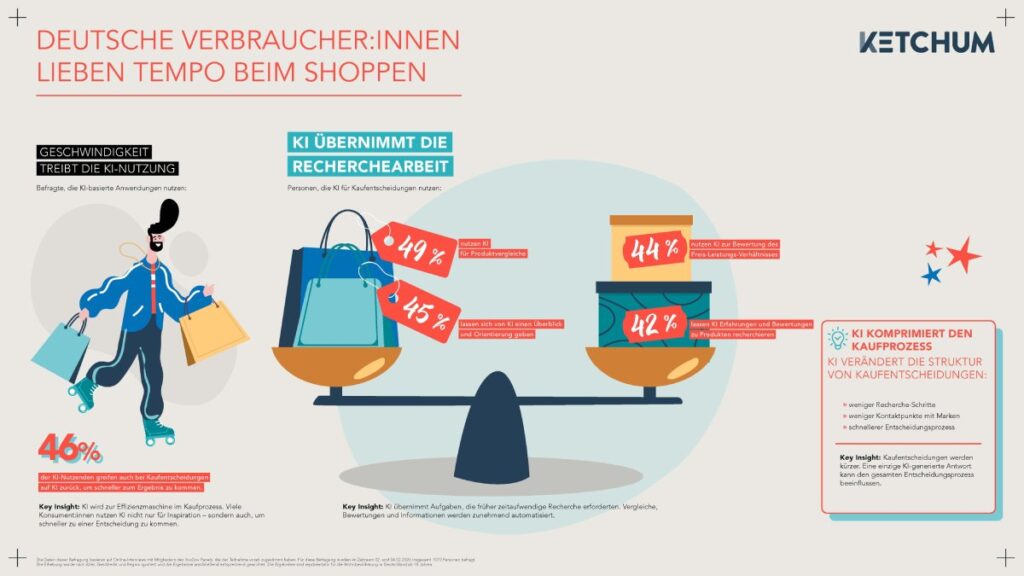 Die Produktvielfalt hat Einkaufen kompliziert gemacht: Zahllose Varianten, Bewertungen, Preisverläufe und Erfahrungsberichte verlängern Kaufentscheidungen. KI kehrt diese Entwicklung um: Sie komprimiert Informationen, entfernt überflüssige Schritte und liefert die relevante Antwort in Sekunden. „Künstliche Intelligenz macht aus einem langwierigen Kaufentscheidungs- und Auswahlprozess ein komprimiertes und effizientes Entscheidungsfenster“, sagt Matthias Wesselmann, CEO von Ketchum Germany. „Wer als Marke in diesem Fenster nicht sichtbar, korrekt wiedergegeben und konsistent ist, existiert für Konsumenten nicht mehr.“